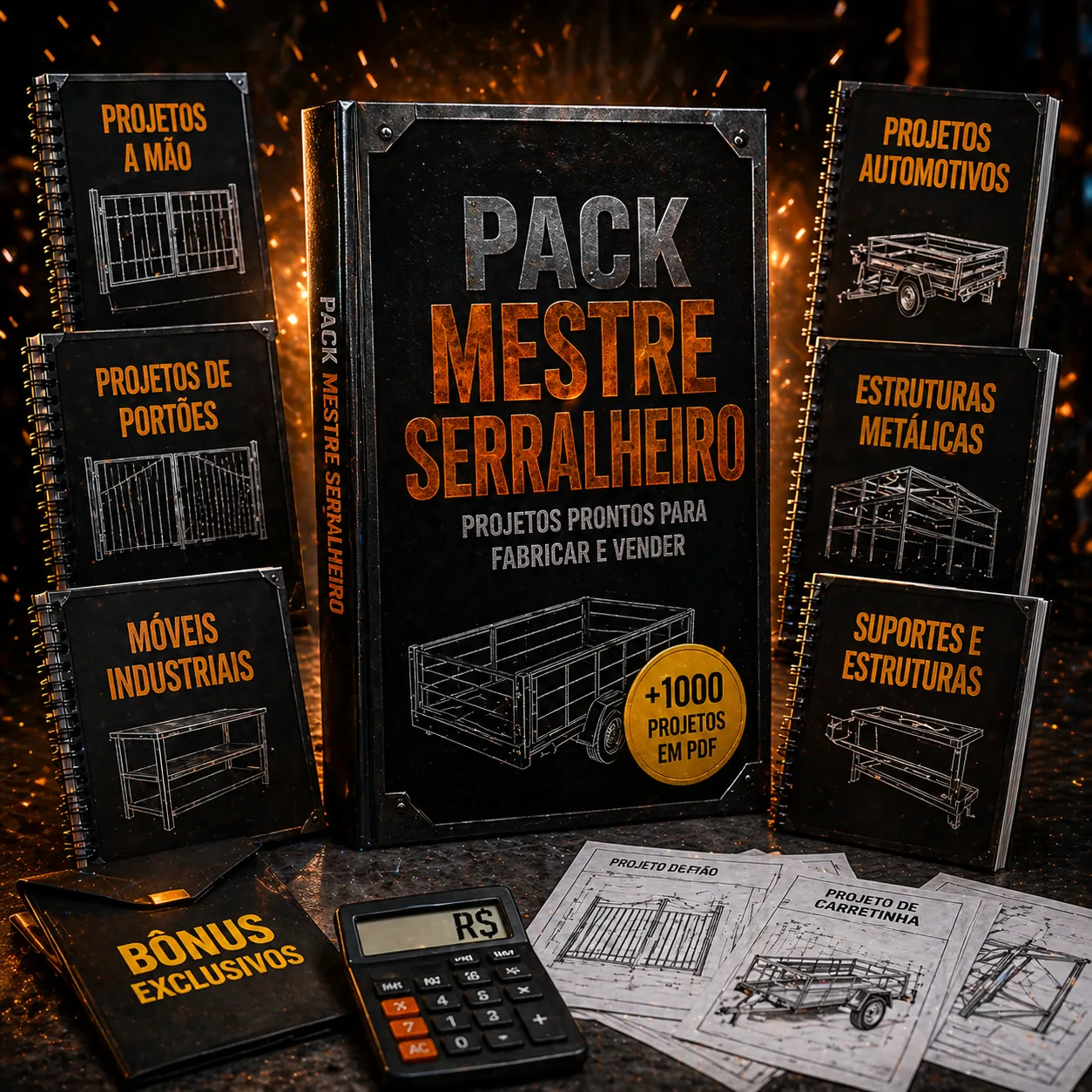 + de 1.000 projetos de serralheria prontos pra você copiar, fabricar e vender — hoje mesmo. Chega de improvisar medida no caderno, perder material e cobrar errado. Você abre o pack, escolhe o modelo, faz o orçamento na planilha e fecha o serviço com lucro.